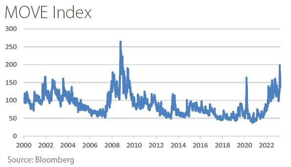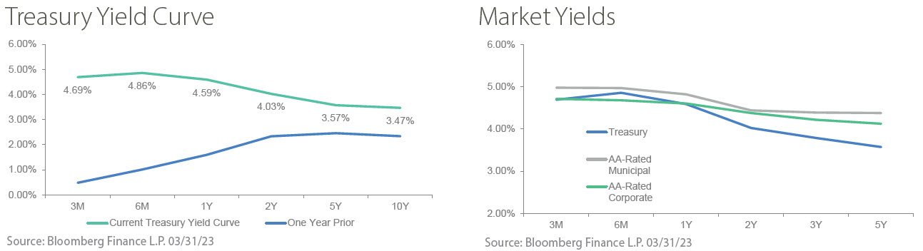 The rates market roared in March as Treasury yields rose and fell sharply in response to economic data and market developments. The 2-year Treasury yield began the month near 4.8%, climbed to over 5% and dipped below 4% during the month. March began with focus on Fed Chair Powell’s congressional testimony indicating the potential for faster rate hikes if employment and CPI data remained strong. Rates then moved sharply lower due to rapidly evolving stress in the banking sector. With uncertainty high and economic data mixed, the Fed opted for a 25 basis point rate hike and softened their language about possible future hikes. March’s moves are a reflection of the continued volatility and bumpy landing we have been expecting for 2023.