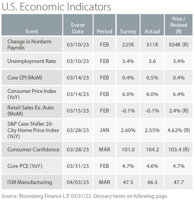The S&P 500 rose more than 3.5% in March despite banking sector developments and bond market volatility. Tech stocks led the way, with the S&P 500’s tech sector climbing 8% since March 8th. A decline in interest rates is widely credited as supporting higher prices for the sector. The rally lacked breadth, however. On March 31, 45% of S&P 500 stocks closed below their 200-day moving average. More economically sensitive sectors were down as recession fears grew during the month.