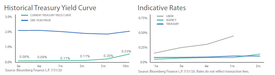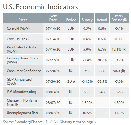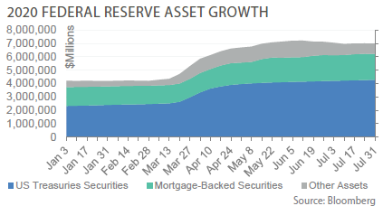 Following a period of extreme market stress in March, the Federal Reserve reopened and created several programs aimed at boosting liquidity across a range of markets. In support of these programs, the Federal Reserve boosted its balance sheet by $2.8 trillion to nearly $7 trillion through July 31st. These massive purchases have supported bond and equity prices, while reducing bond yields. Purchases of U.S. Treasuries and mortgage-backed securities have together totaled nearly $2.5 trillion in 2020. Other asset growth has included loans from the Paycheck Protection Program of $70 billion, the Corporate Credit Facility of $44 billion, the Main Street Lending Program of $38 billion and the Municipal Liquidity Facility of $16 billion.
