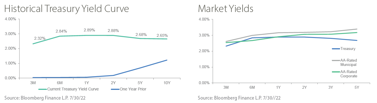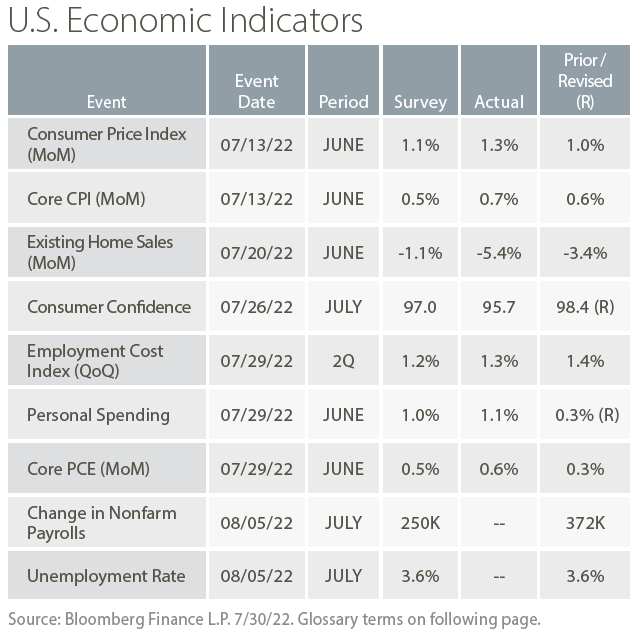 The final week of July included another 75 basis point rate hike by the Federal Reserve and the second consecutive quarterly decline in GDP. The Fed Funds rate is now at 2.25-2.5%, and has increased as much in 2022 as in the previous three years of hikes from 2015-2018. In a press conference following the Federal Open Market Committee meeting, Fed Chair Jerome Powell continued to emphasize the need to slow growth to help reduce inflation. The following day, the Bureau of Economic Analysis announced a 0.9% decrease in U.S. GDP. The report showed slower consumer growth and negative growth for businesses and governments. Imports also slowed compared to robust first quarter growth. The GDP report may be just what the Fed was looking for as it seeks to slow growth while avoiding a deep recession.