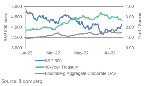 Markets turned generally more optimistic in July as the S&P 500 reported its strongest monthly returns since 2020, and growth meaningfully outperformed value. In bond markets, credit spreads declined for investment grade companies. The lower option adjusted spread (OAS) shows investors saw less credit risk for investment grade companies in July. Treasury returns were also positive in July as longer term yields, including the 10-year US Treasury, declined for the month. While the decline in Treasury yields generally portrays growth concerns, strong stock market returns and lower spreads reflect the large amount of downside that was already priced into markets.