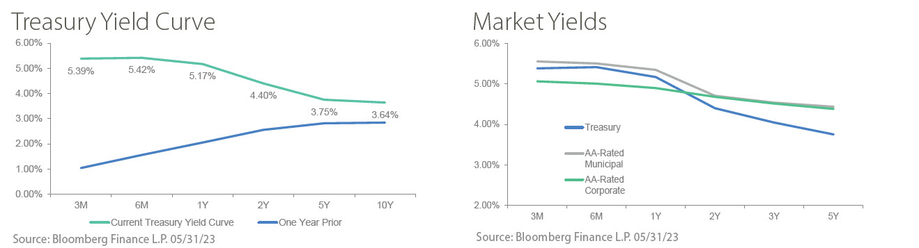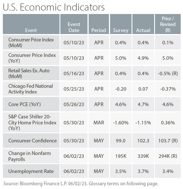 Markets closely watched developments in the debt ceiling debate throughout May. During this time, many investors such as money market funds and local government investment pools avoided Treasury maturities during June. This created substantial dislocation in the Treasury Bill market as June maturities traded at much higher yields than would otherwise be expected. As of June 2, both the House and Senate passed a bill aligned with a deal struck with President Biden to avert a possible Treasury default and suspend the debt ceiling through January 1, 2025. Markets can take a breath and refocus on economic growth expectations.