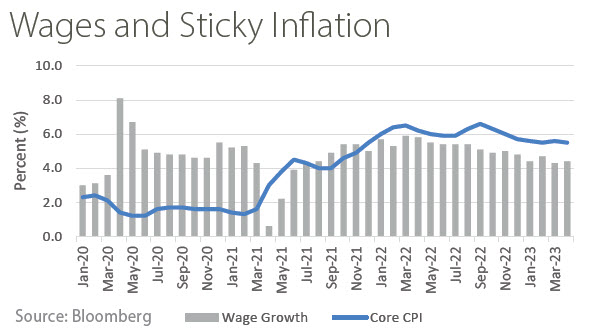 While CPI and Core CPI have steadily declined over the past year, wage growth has remained elevated. Following a November 2022 speech by Federal Reserve Chair Powell, many economists and market participants have focused on the impact of wages on non-housing services inflation. This has been one of the “stickier” areas of inflation. In the 2022 speech, Chair Powell said, “Because wages make up the largest cost in delivering these services, the labor market holds the key to understanding inflation in this category.” One additional rate hike in June or July is looking increasingly likely as the Fed seeks to reduce inflation in a continued strong employment market.