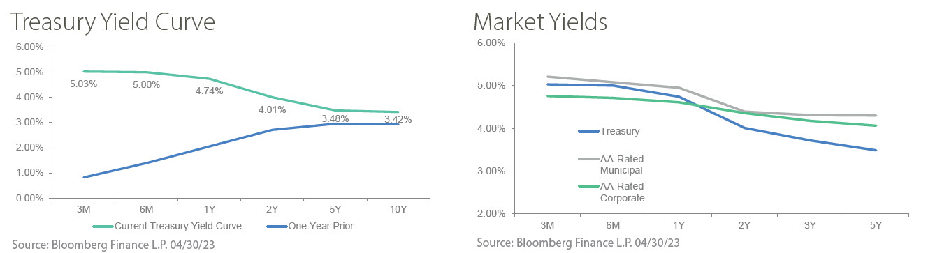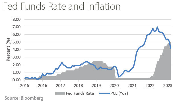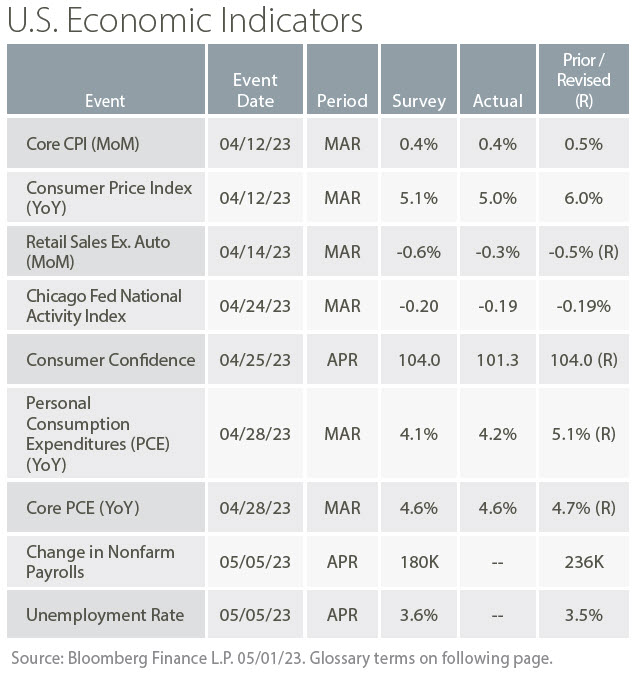 The “dot plots” released by the Fed in March depicted their plans to hike rates one more time this year and then hold rates steady. The Fed has also stated they remain data dependent and thus Personal Consumption Expenditures (PCE), the Fed’s preferred measure of inflation, is an important data point. By this measure, inflation slowed to 4.2% in March. This level is below the upper bound of the targeted fed funds rate of 5%, indicating the Fed is near the end of its rate hiking cycle. Looking forward, we see economic growth as a key consideration for the Fed as they determine the path of monetary policy.