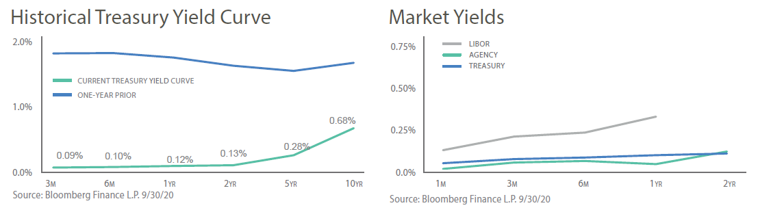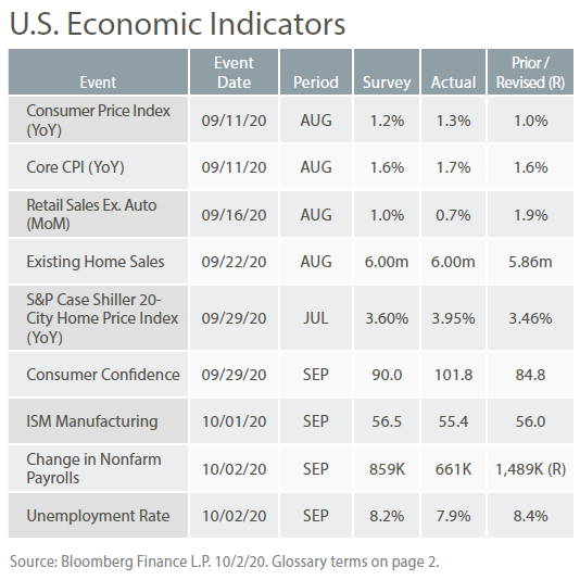 U.S. stocks were broadly lower in September with notable weakness in the large-cap technology sector, which had been a strong performer this year. Nonetheless, the S&P 500 reported an 8.5% gain in the 3rd quarter despite a loss of nearly 4% in September. Meanwhile, the VIX, a measure of stock market volatility also increased in September. Volatility is expected to remain high through the Fall and the risk of a disputed U.S. presidential election has caused a spike in VIX futures around the November vote.