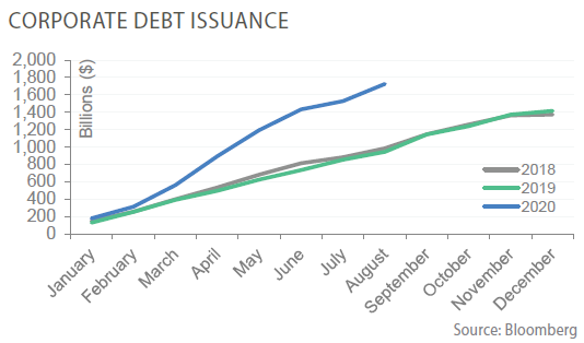 U.S. companies issued more debt through the first 8 months of 2020 than in all of 2019 and total outstanding debt sits at record highs. A recent Moody’s report focused on the lengthening maturities of newly issued debt at historically low yields and concluded this enhances financial flexibility. However, the same report also noted that the recent debt issuance boom limits future borrowing. As prudent investors, we believe strong balance sheet management is crucial to maintaining healthy credit quality. Indeed, terming out debt is preferred over more volatile short-term debt, but capital structure also requires sufficient equity. Higher leverage may reduce companies’ future ability to borrow which could have negative impacts on company balance sheets as well as economic growth.