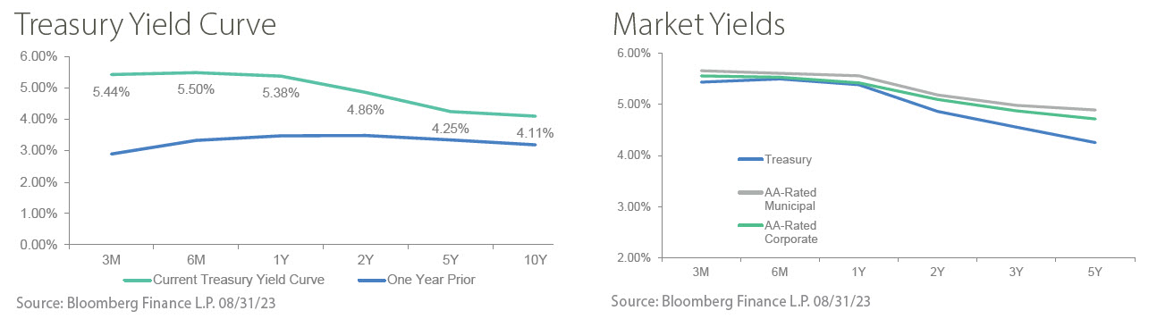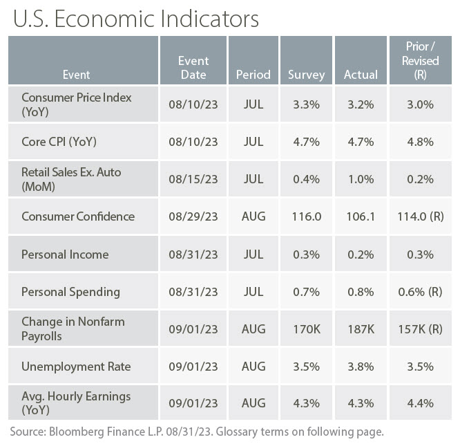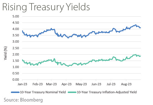 The yield on the 10-Year US Treasury rose in August to its highest level since 2007. The month saw real yields rise even more and are now at the highest level since 2009. Real, or inflation-adjusted, yields reflect the difference between the expected levels of inflation and nominal Treasury yields. Myriad factors impact nominal and real yields including supply and demand. Nonetheless, the rise in real yields produces increasing restraint on the economy in the face of declining expected future inflation. More broadly, higher yields reflect investors’ belief that the Fed is likely to keep rates high and that the economy is unlikely to slow sharply in the near term.